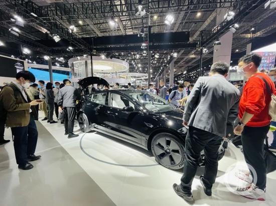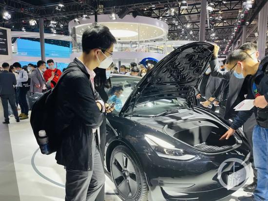 4月23日,上海,上海车展特斯拉展台观众较往日有所增加,但一半客户在询问刹车问题。/记者 时婷婷