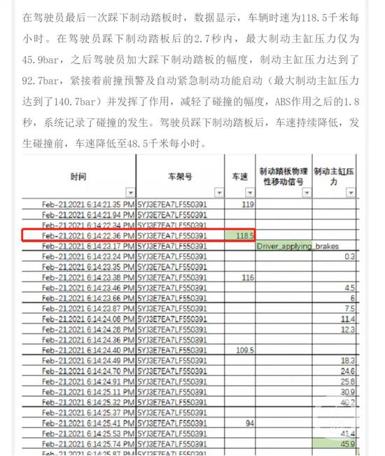 4月22日,特斯拉公布了张某车辆事故前半小时的车辆数据,并解释称在驾驶员最后一次踩下制动踏板时,数据显示,车辆时速为118.5千米每小时。在驾驶员踩下制动踏板后的2.7秒内,最大制动主缸压力仅为45.9bar,之后驾驶员加大踩下制动踏板的幅度,制动主缸压力达到了92.7bar,紧接着前撞预警及自动紧急制动功能启动(最大制动主缸压力达到了140.7bar)并发挥了作用,减轻了碰撞的幅度,ABS作用之后的1.8秒,系统记录了碰撞的发生。驾驶员踩下制动踏板后,车速持续降低,发生碰撞前,车速降低至48.5。